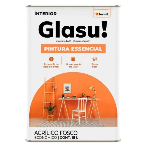 Suvinil glasu 18ldescubra a perfeição em pintura com o suvinil glasu 18l, a tinta que combina elegância e resistência para transformar seus espaços. ideal para quem busca um acabamento sofisticado, essa tinta é perfeita para interiores.características:características:acabamento foscorendimento: 70m² acabadosdiluição: pronta para usosecagem rápida
