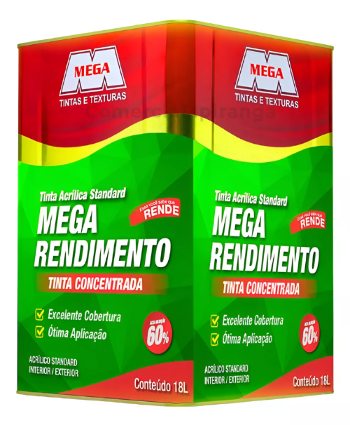 Mega rendimentomega rendimento, o produto que transforma suas expectativas em realidade. projetado para pinturas externas e internas, oferece resultados excepcionais, ele é ideal para quem busca o melhor desempenho em suas tarefas diárias.serve para pinturas: externas e internasacabamento foscorendimento: até 34m² acabadosantimofodiluição: até 60% com águasecagem rápida